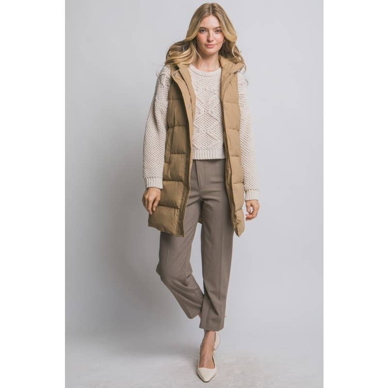This hooded, long quilted puffer vest features a zip and snap closure, convenient side pockets, and a sleeveless design for ease of movement. Perfect layering piece for any outfit!