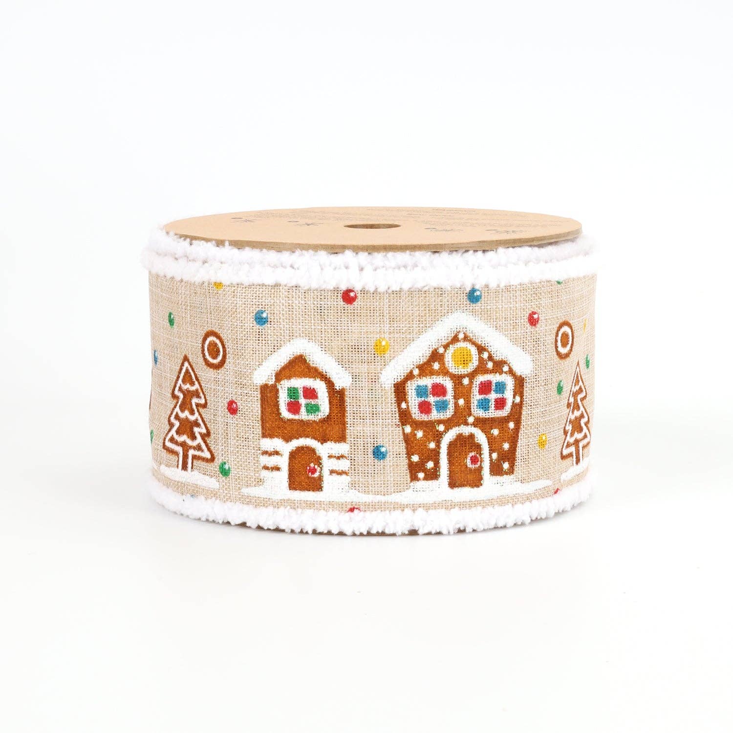 * Whimsical Gingerbread House Design: Elevate your holiday projects with our 2 1/2" Wired Ribbon featuring a delightful gingerbread house pattern on a natural ribbon. The whimsical design adds a touch of festive charm and sweetness to your creations.