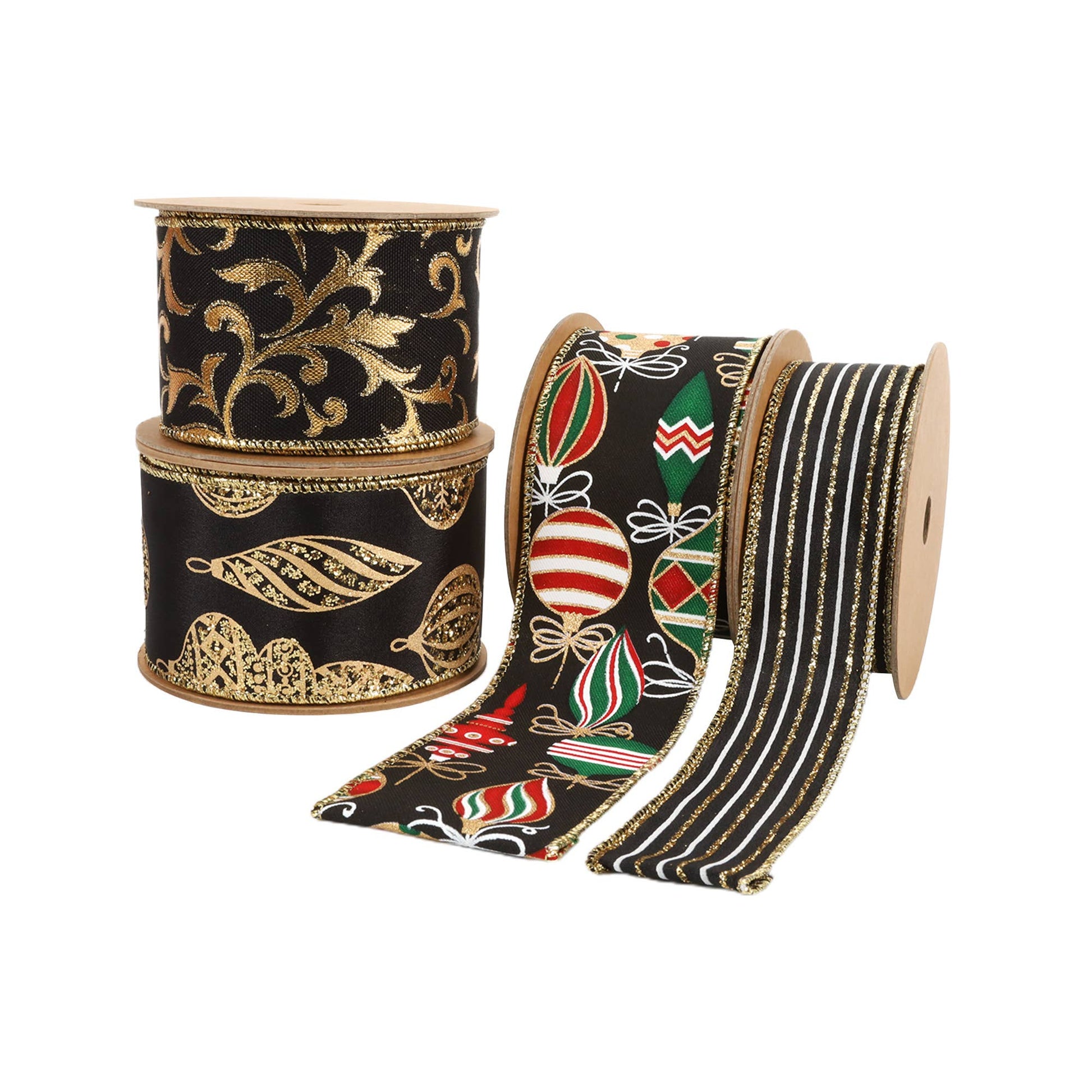 * Captivating Holiday Ornament Design: Our 2 1/2" Wired Ribbon boasts a charming black ribbon adorned with vibrant multi-colored holiday ornaments, creating a captivating and festive appeal for your holiday decorations. Each roll comes with 10 yards of ribbon, providing ample material to accommodate various decorating needs and creative endeavors.