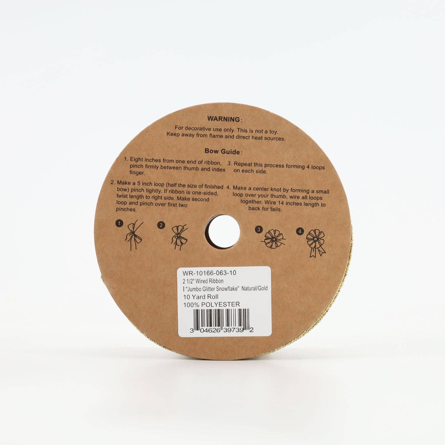 * Striking Jumbo Gold Glitter Snowflake on Natural Ribbon: Our 2 1/2" Wired Ribbon showcases a bold and eye-catching jumbo gold glitter snowflake design on a crisp natural ribbon, perfect for adding a festive and dazzling touch to your holiday decorations and crafts. Each roll comes with 10 yards of ribbon, providing ample material to accommodate various decorating needs and creative endeavors.