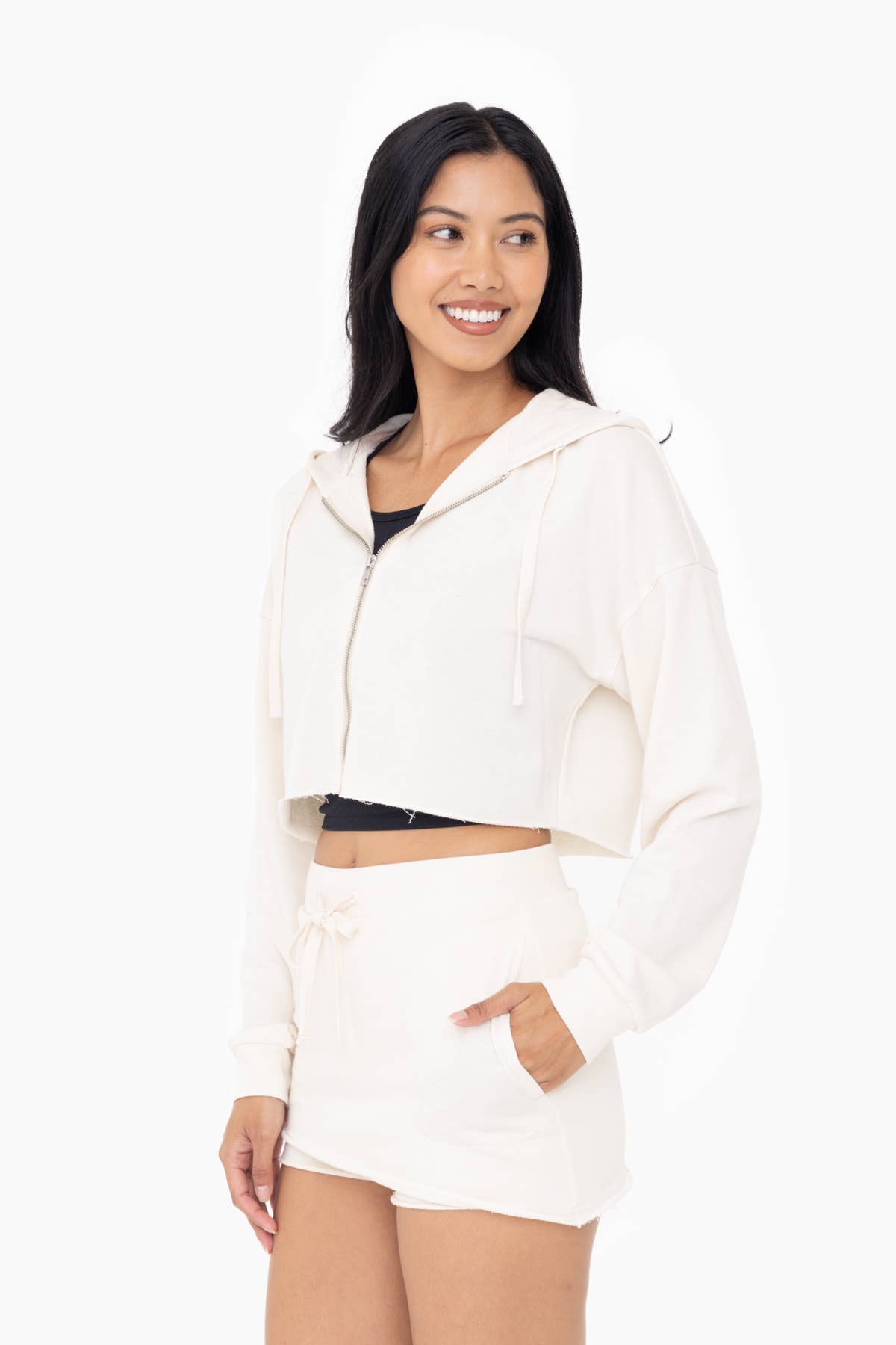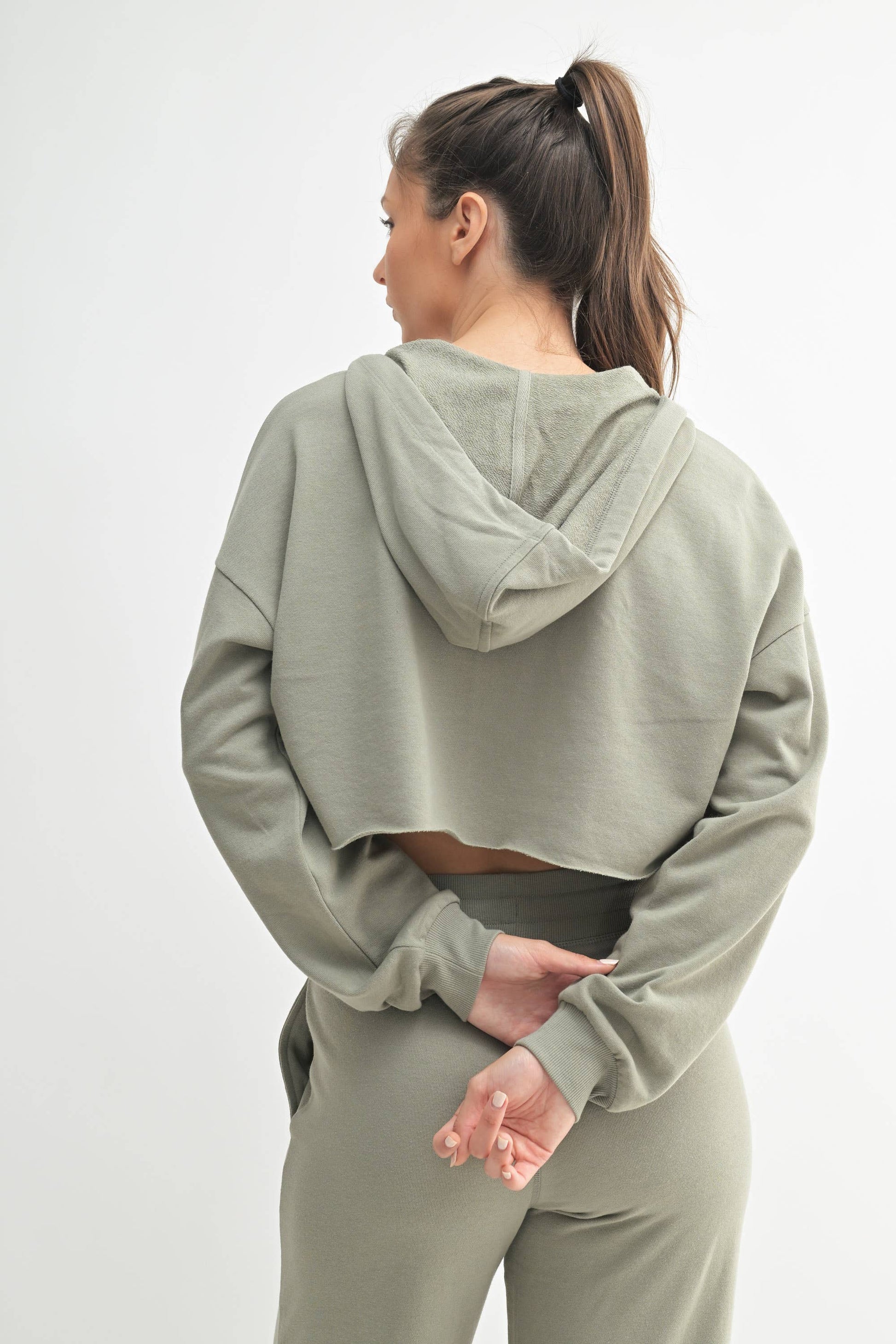 We just love how versatile this crop jacket is. It features a hoodie, metal zipper closure, raw bottom edge, and is just perfect to wear with your activewear for an athleisure look, or jeans for a casual look. Pairs perfectly with our French Terry joggers.