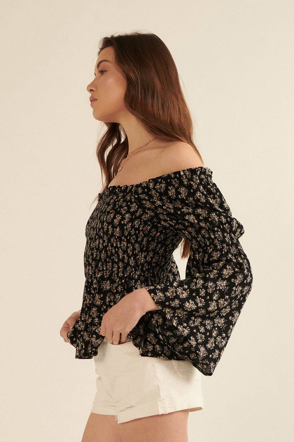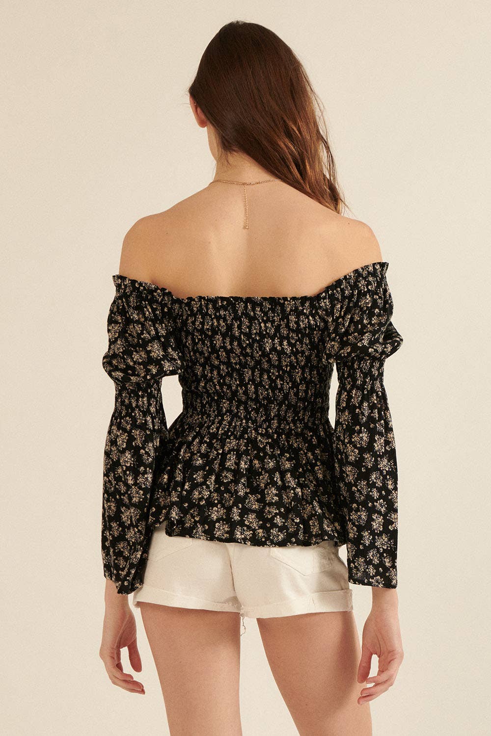 A sophisticated woven peasant blouse featuring an elegant floral pattern. The expertly smocked bodice complements the off-shoulder neckline adorned with delicate ruffle trim. Distinguished by its long, flowing peasant sleeves, the Layla Blouse incorporates a tasteful ruffled waist detail while maintaining a comfortable, relaxed silhouette.