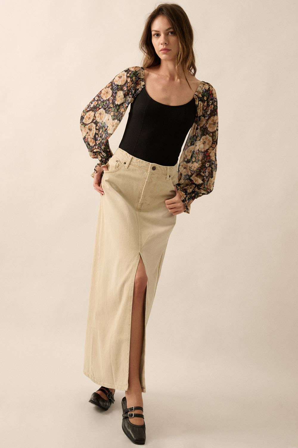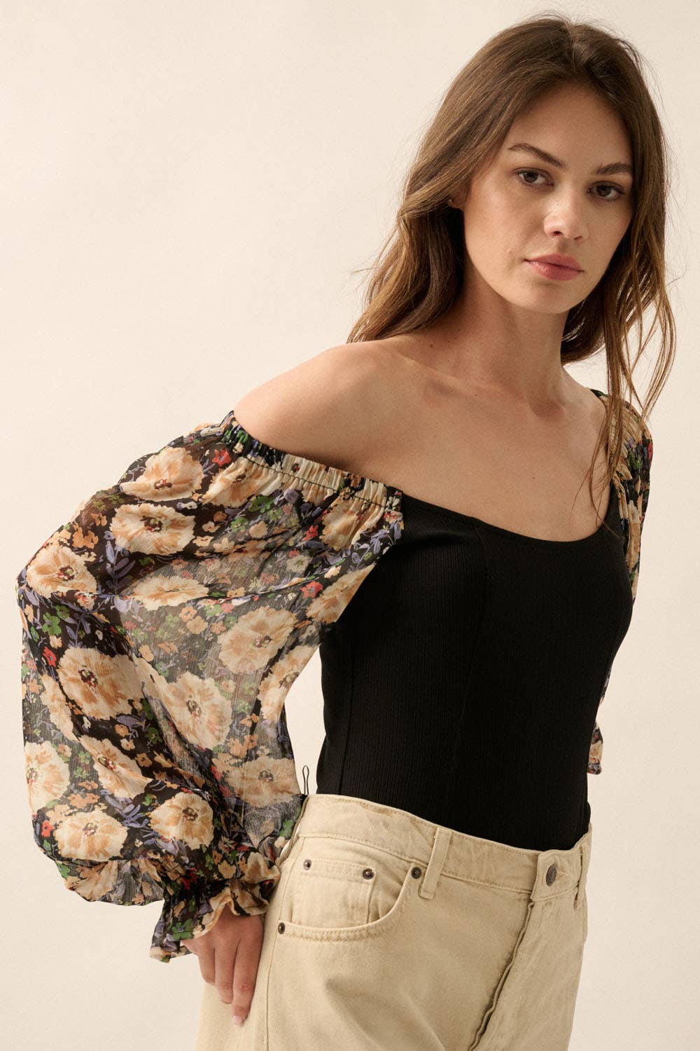 A floral-patterned ribbed knit bodysuit featuring a scoop neckline and elongated balloon sleeves crafted from translucent material. The design incorporates smocked cuffs with delicate ruffling, princess seaming through the bodice, and a low-cut back. The garment provides complete coverage with a functional snap closure at the crotch and presents a contoured silhouette.