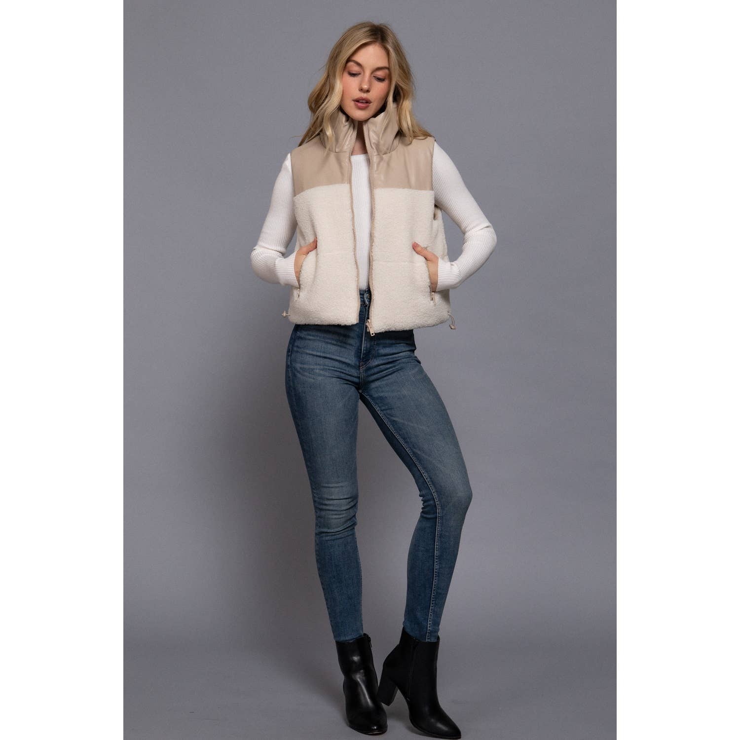 Elevate your outerwear collection with this reversible faux leather-sherpa crop vest, expertly designed to offer versatility and style in one piece. One side features sleek faux leather that brings a modern, edgy appeal, while the reverse shows soft sherpa padding with a contrasting texture that enhances warmth and comfort. The cropped cut adds a contemporary silhouette, perfect for layering over your favorite tops or dresses. Ideal for transitional weather, this vest combines functional insulation with fashion-forward design, giving you two distinct looks in a single garment without compromising on quality or comfort.