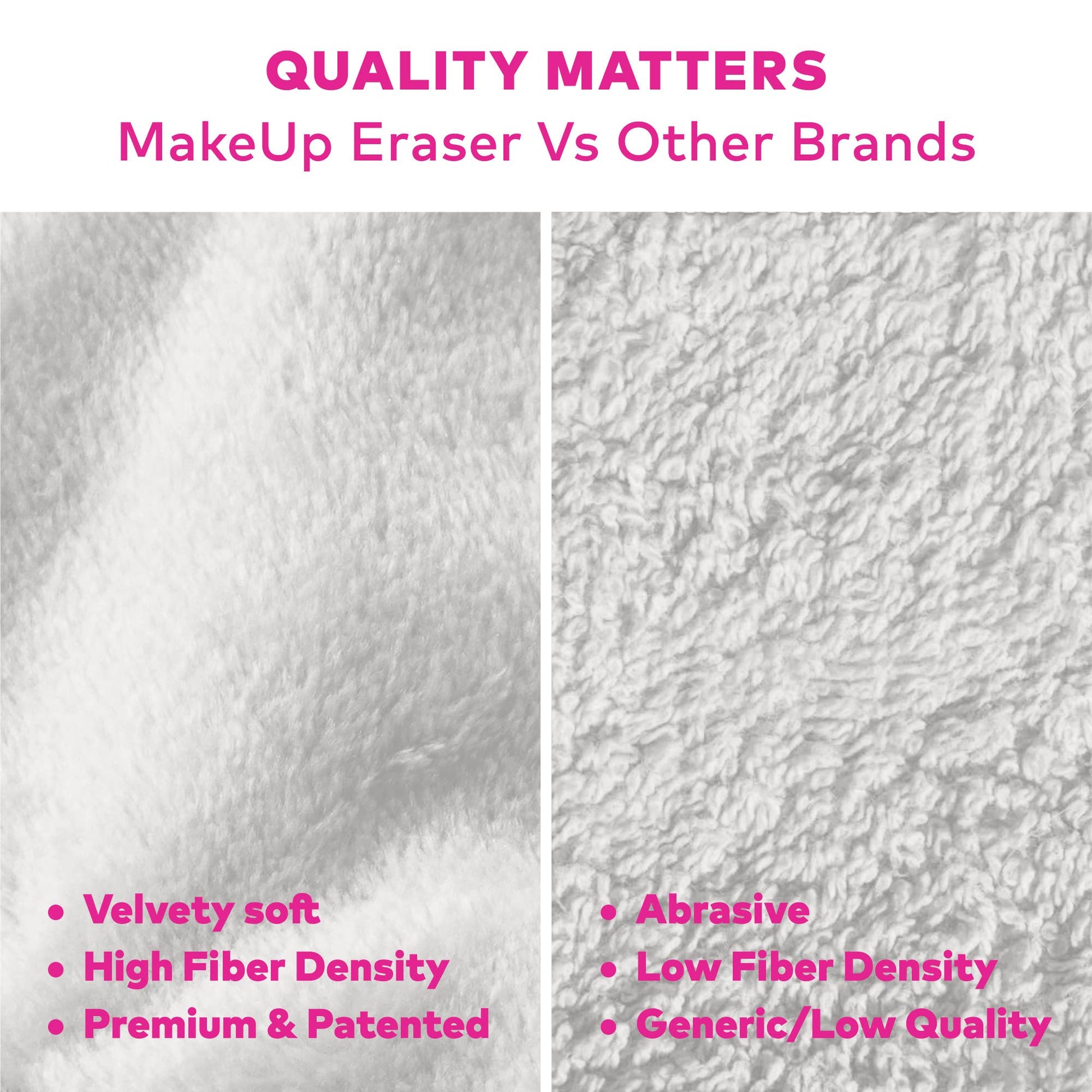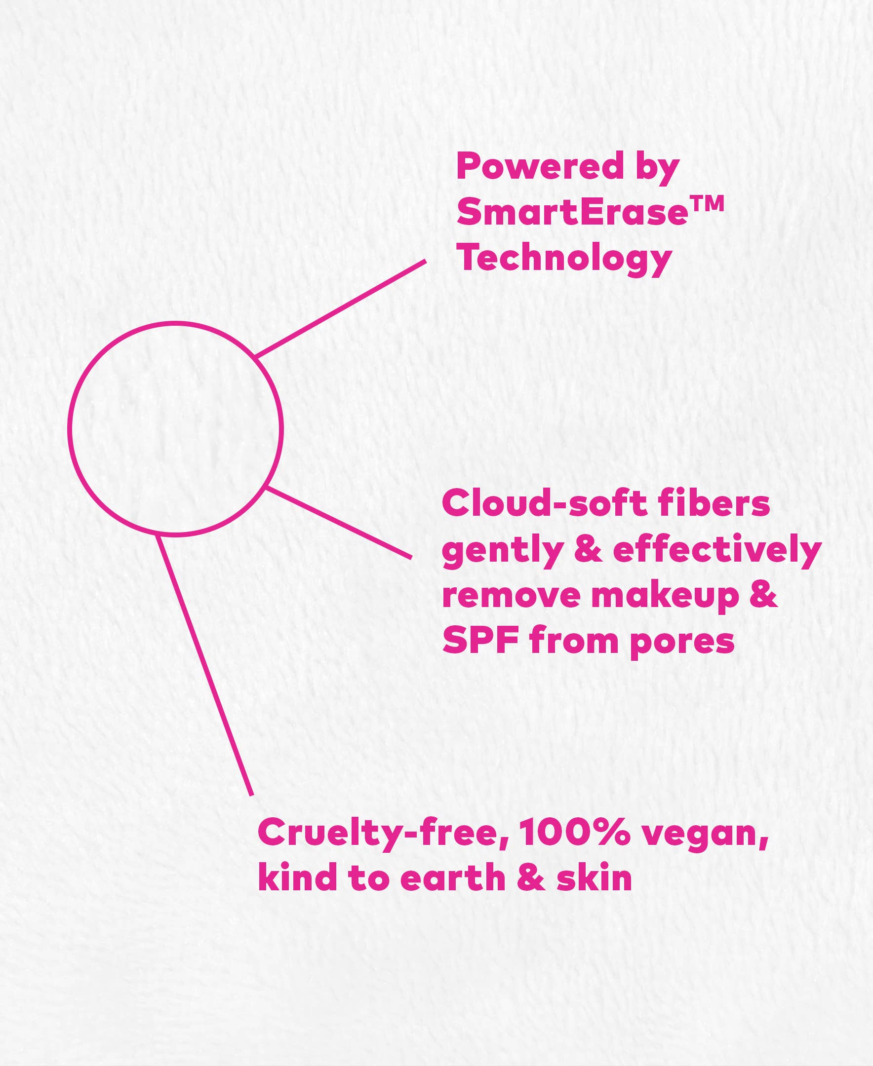 7 Cloths + Laundry Bag + (1) Toiletry Ballet Bag & PLUSH travel bag-LIMITED EDITION gift set. Our Teddy Bear designed sustainable MakeUp Eraser set comes with a plush makeup/toiletry bag to store all your essentials. MakeUp Eraser®—where tech meets clean, nostalgic, trendsetting, no waste beauty. This Makeup Remover is THE essential! Say goodbye to wasteful wipes & hello to clean beauty with the Original MakeUp Eraser®—your essential, eco-friendly face cloth that erases all makeup with JUST WATER™. From heavy foundation and SPF to lip stains and waterproof mascara, our patented SmartErase™ Technology lifts it all away—no oils, no chemicals, no waste. Crafted with millions of cloud-soft fibers, this reusable, machine-washable cloth is 2.5x more effective than traditional makeup wipes & safe for all skin types, including sensitive skin & lash extensions. One side removes makeup, while the other gently exfoliates. ✔