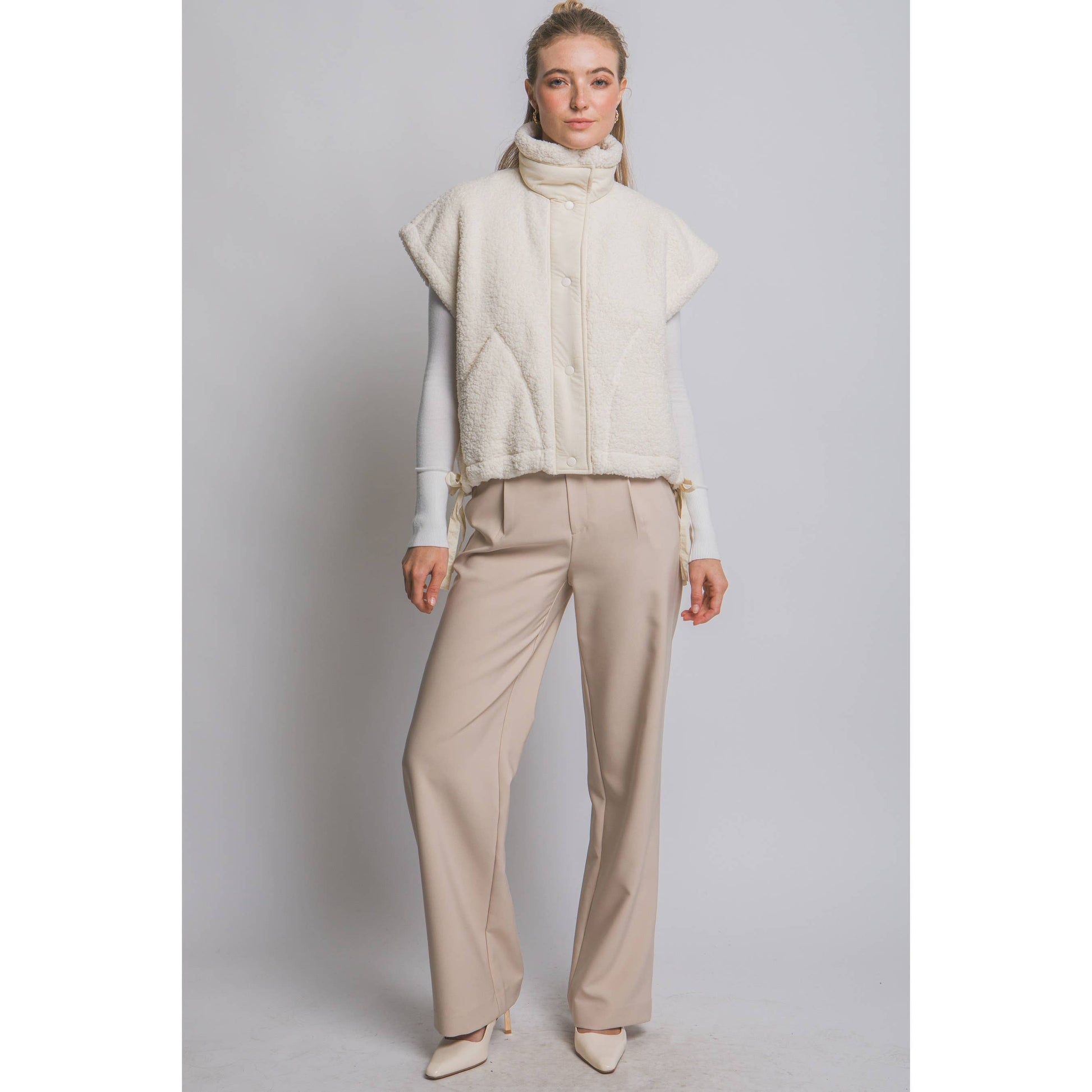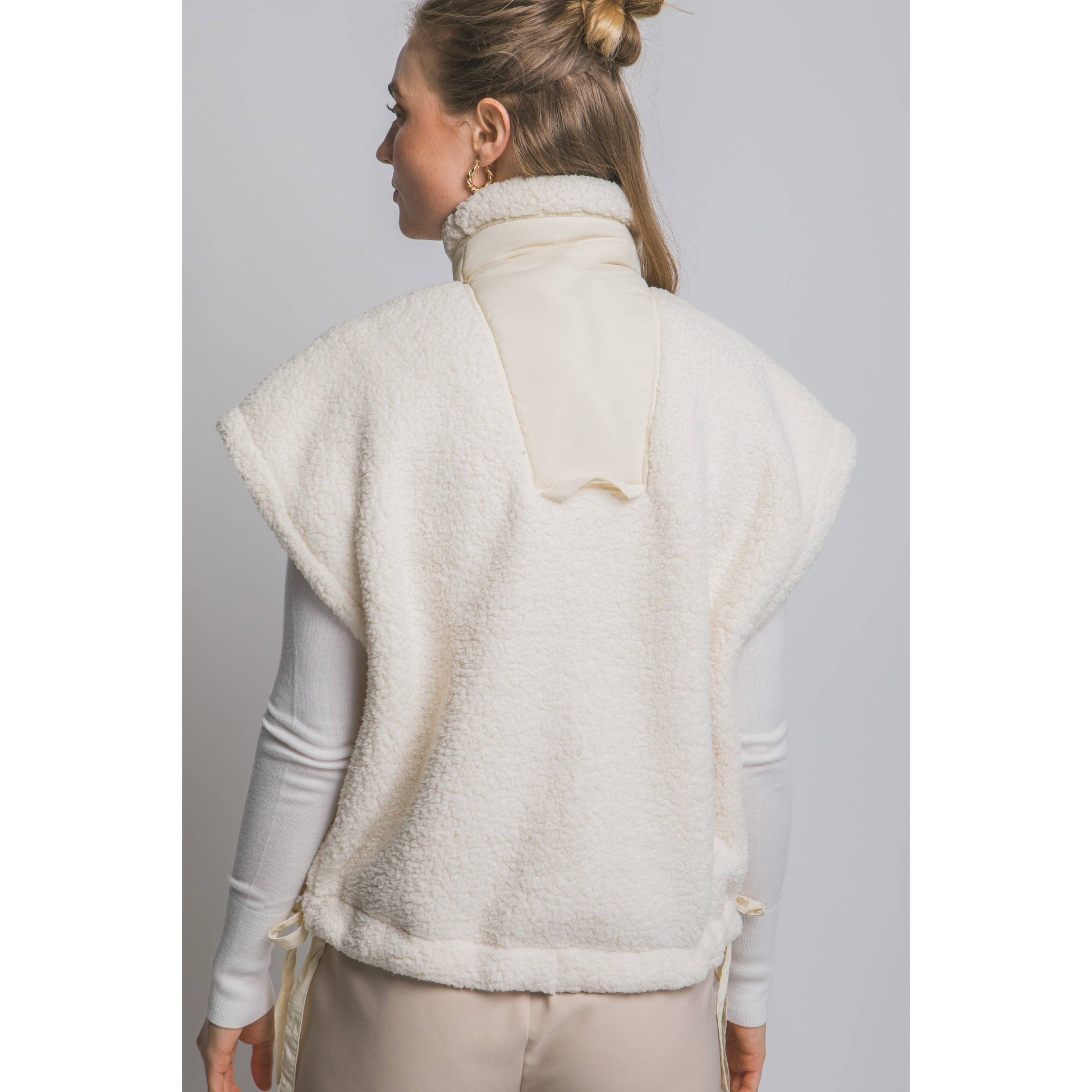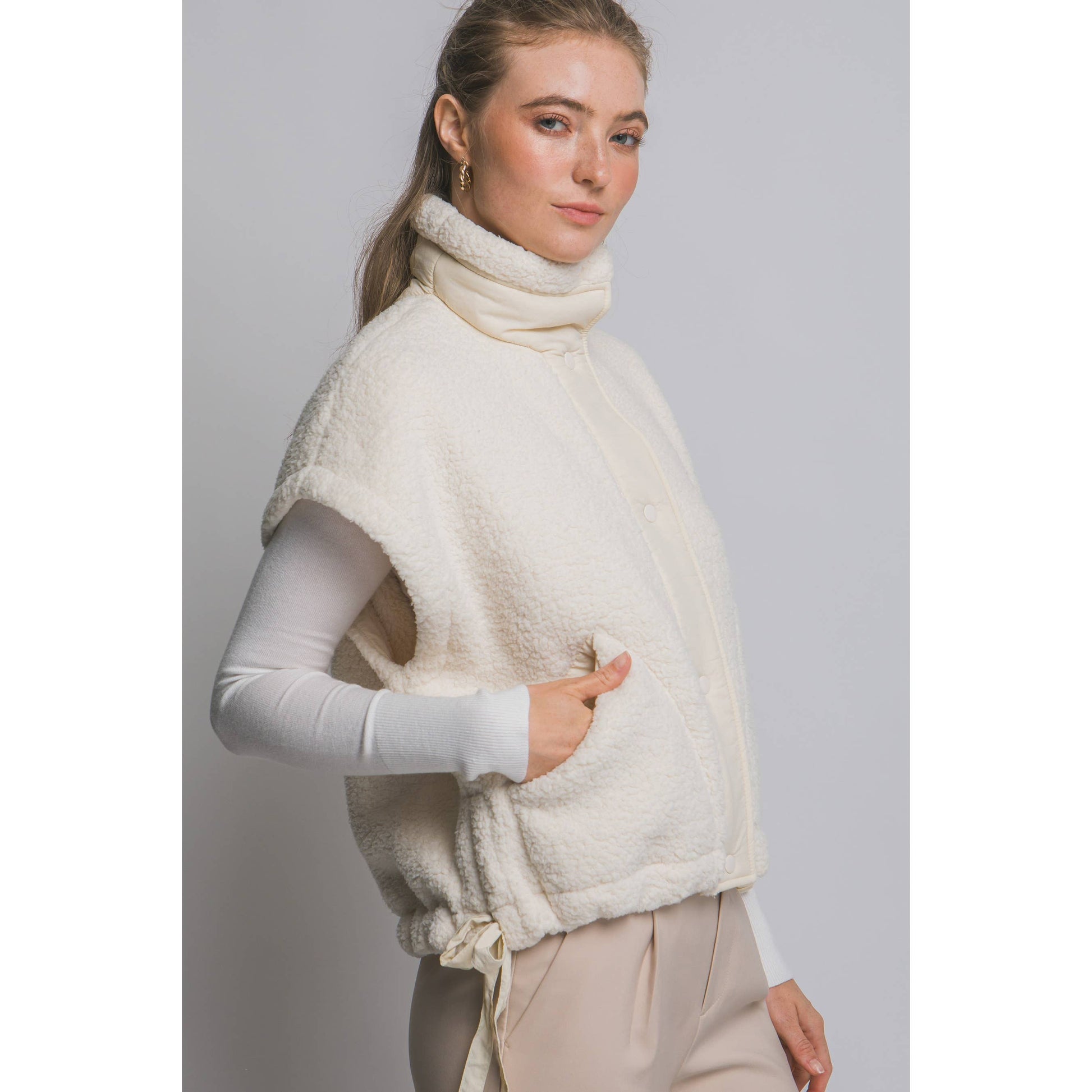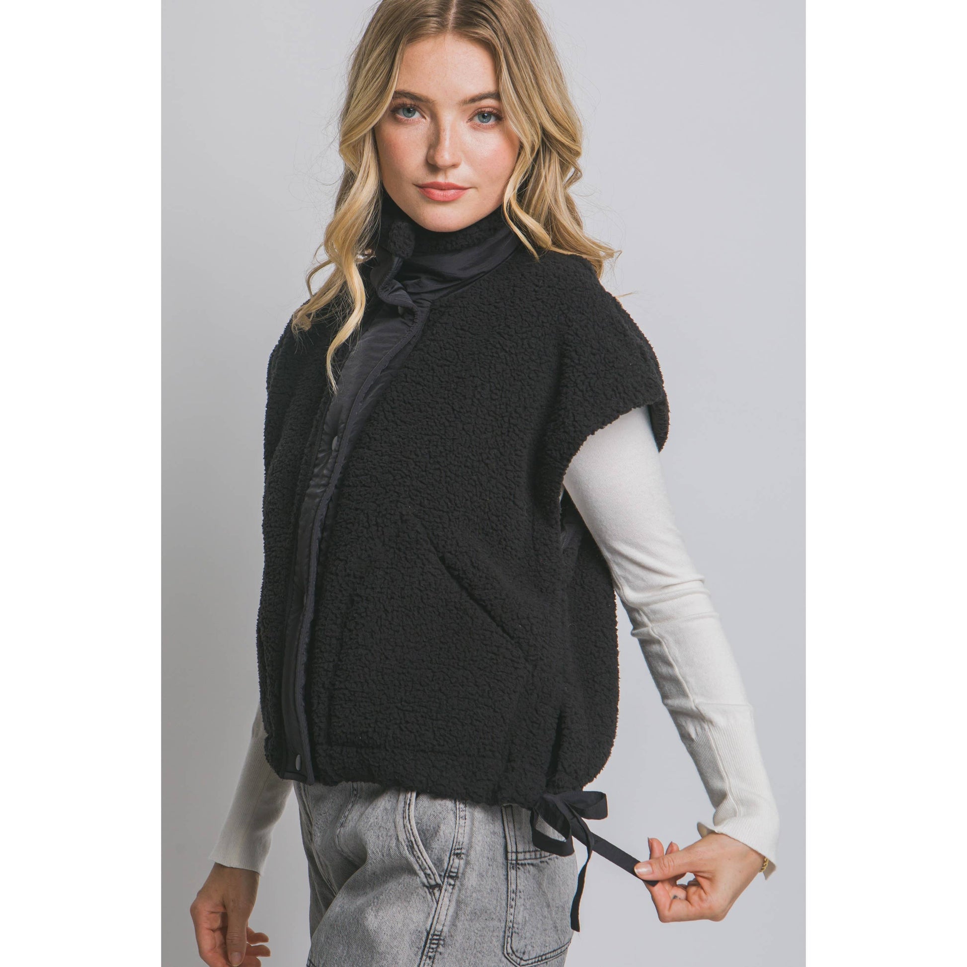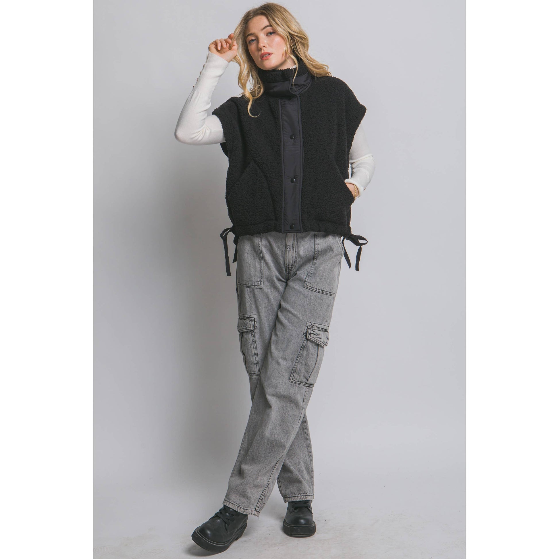 The Teddy Sherpa Oversized Vest combines comfort and style with its plush sherpa fabric and spacious oversized fit. Designed with a mock neck for added warmth, it features two convenient hand pockets perfect for keeping essentials close or warming your hands on chilly days. Contrast material details enhance the vest’s modern aesthetic, while the cinchable waist with side ties allows you to customize the silhouette for a flattering, tailored look. This versatile vest is ideal for layering, offering both functional warmth and a fashionable edge to your casual wardrobe.