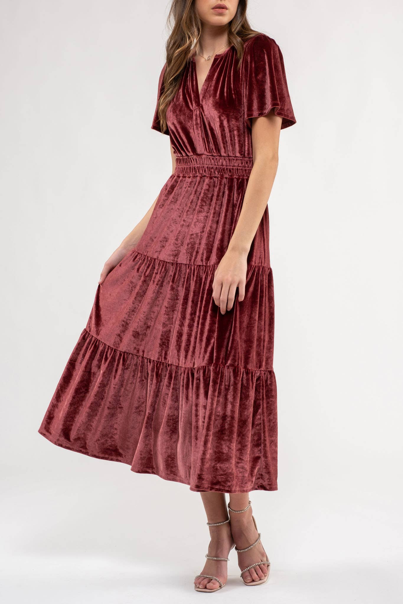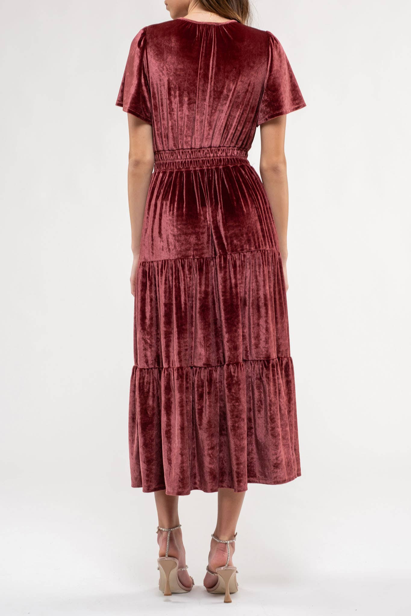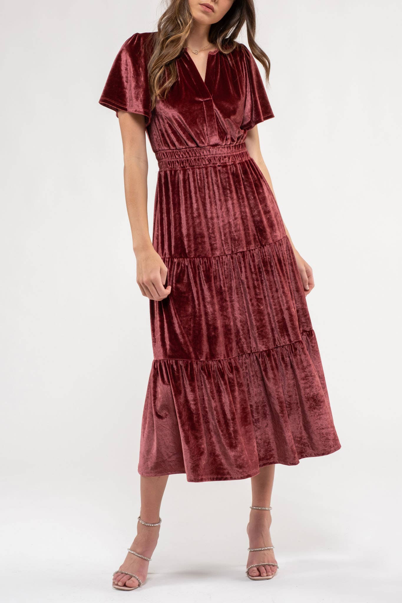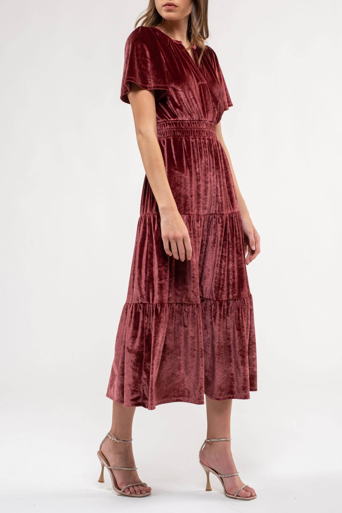 Perfect for those holiday occasions, this velvet dress features a tiered empire waist, creating a flattering silhouette. The midi length adds a touch of sophistication, while the soft velvet material adds a touch of luxury. Make a statement with this unique and stylish dress.