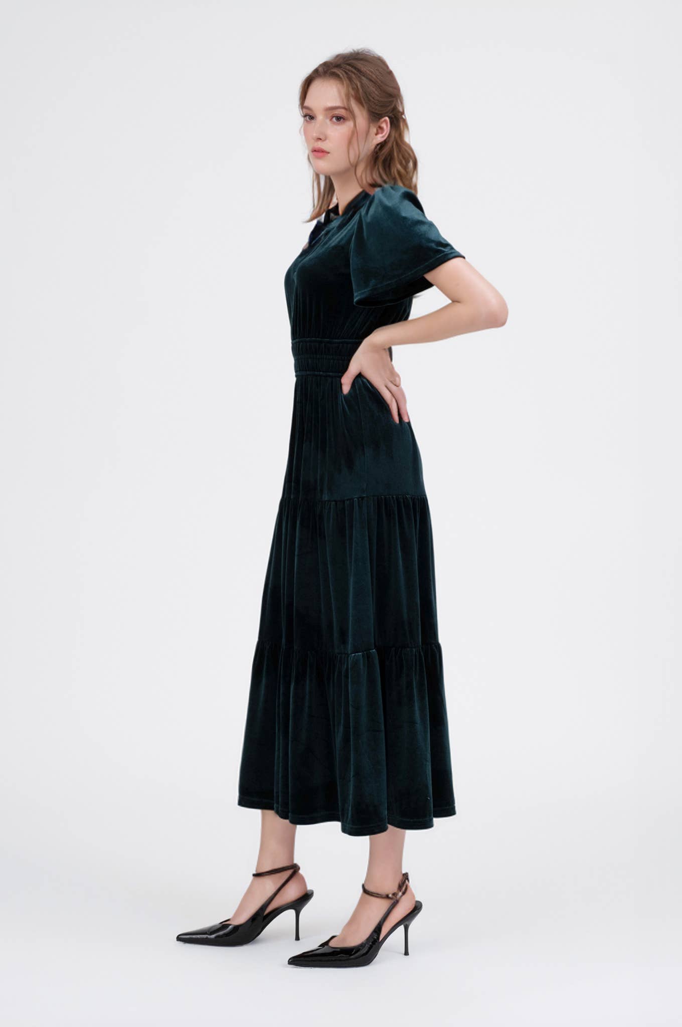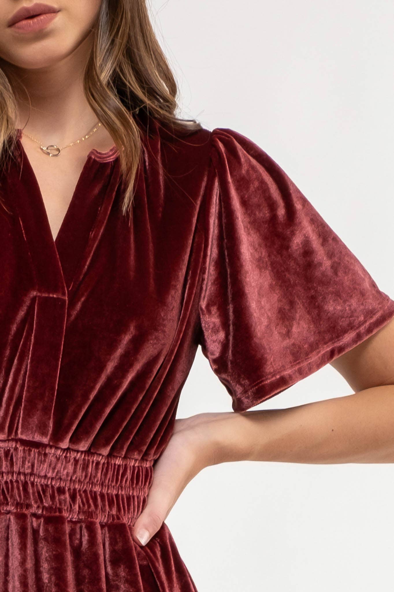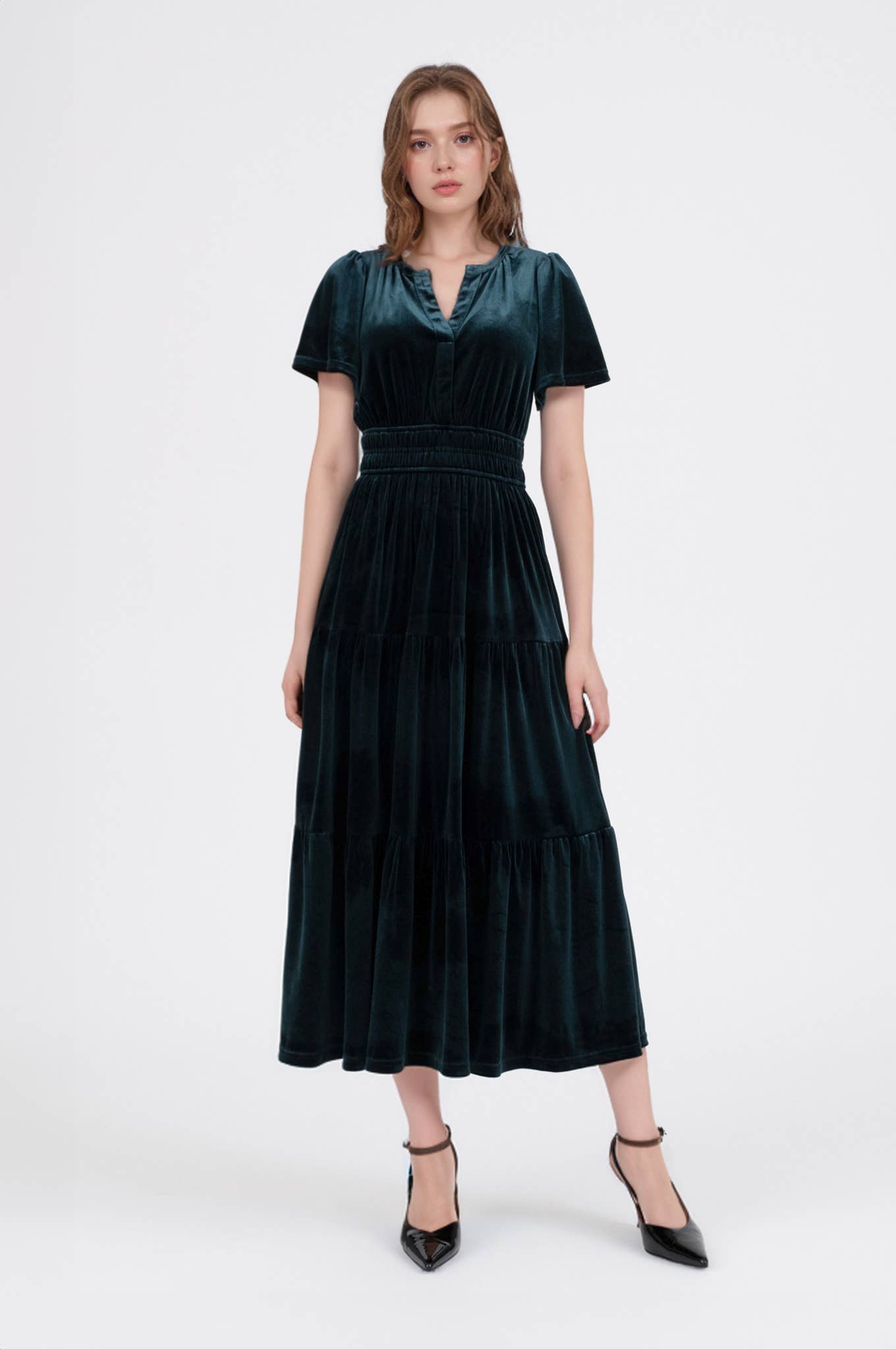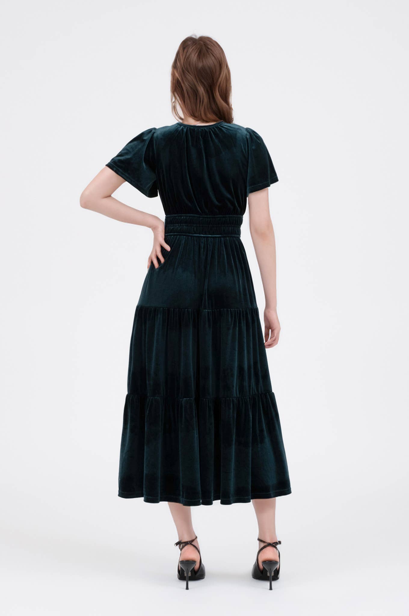 Perfect for those holiday occasions, this velvet dress features a tiered empire waist, creating a flattering silhouette. The midi length adds a touch of sophistication, while the soft velvet material adds a touch of luxury. Make a statement with this unique and stylish dress.